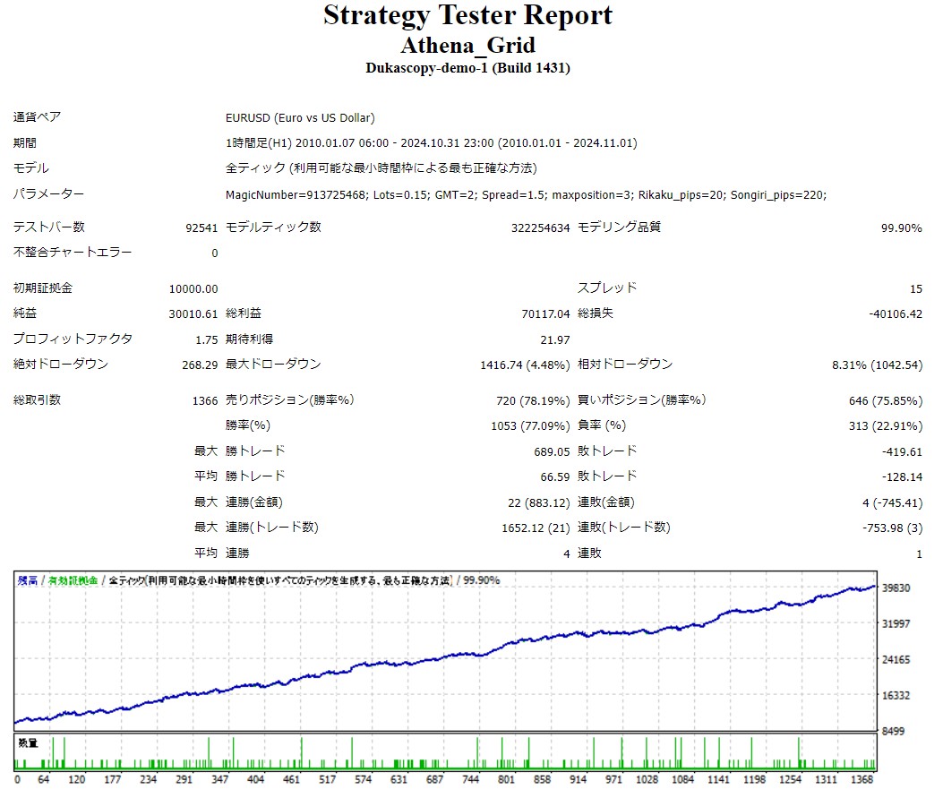 この度ご紹介するAthena_Grid_H1_EURUSDは、安定したパフォーマンスとリスク管理を重視したトレードシステムです。 シンプルで使いやすい設計を追求し、初心者の方から経験豊富なトレーダーまで幅広くご活用いただける内容となっております。