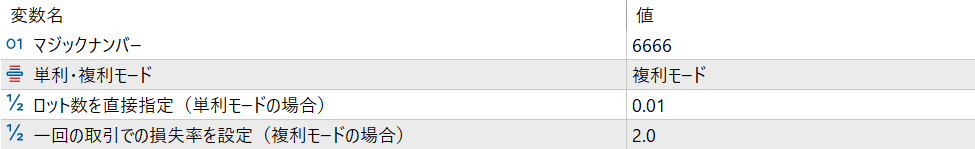 設定項目は基本的に注文ロット数に関するもののみです。(単利・複利モードを指定可能)
