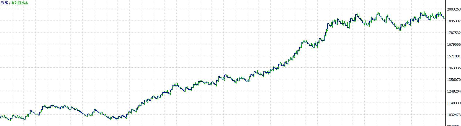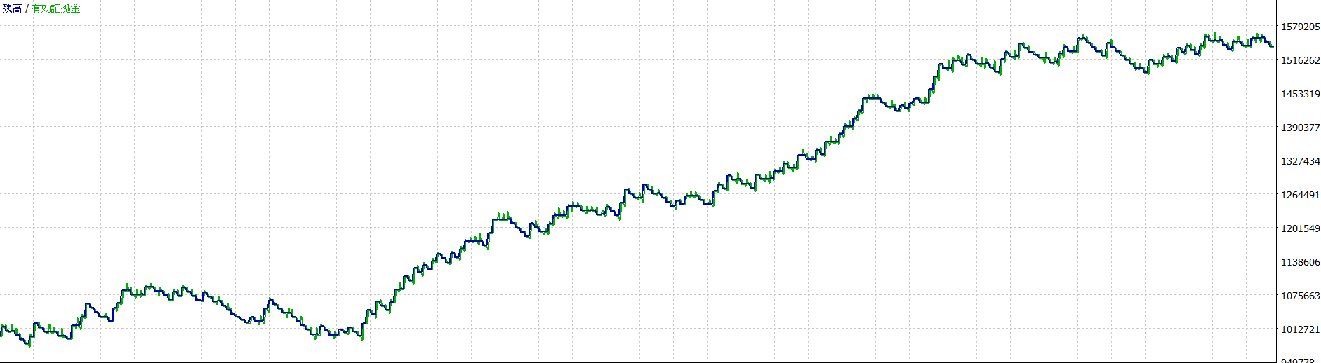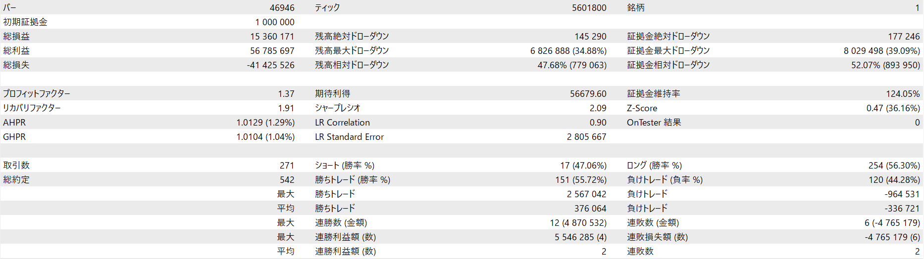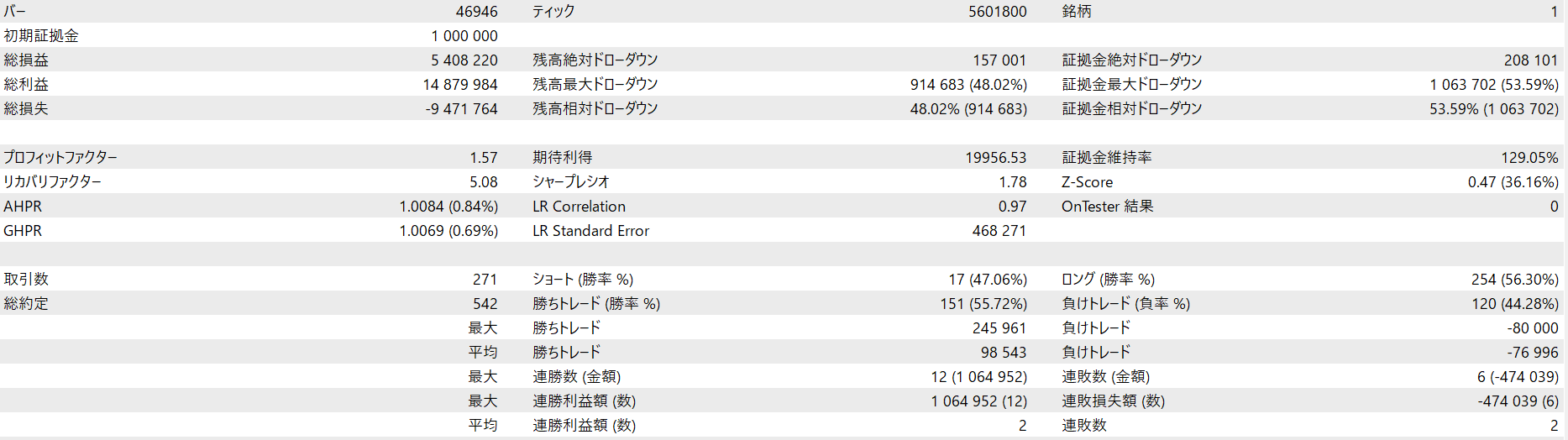 全て1,000,000JPYの証拠金、レバレッジ1:25にて計測しています。 ※レバレッジは計測結果に基本的には影響を与えませんが、極端に低いレバレッジだとポジションが取れない場合もあります。 kotei_lotがtrueの場合
