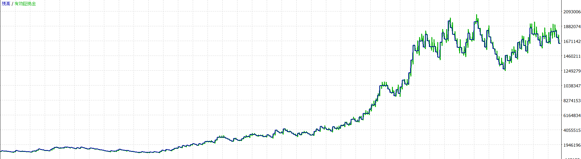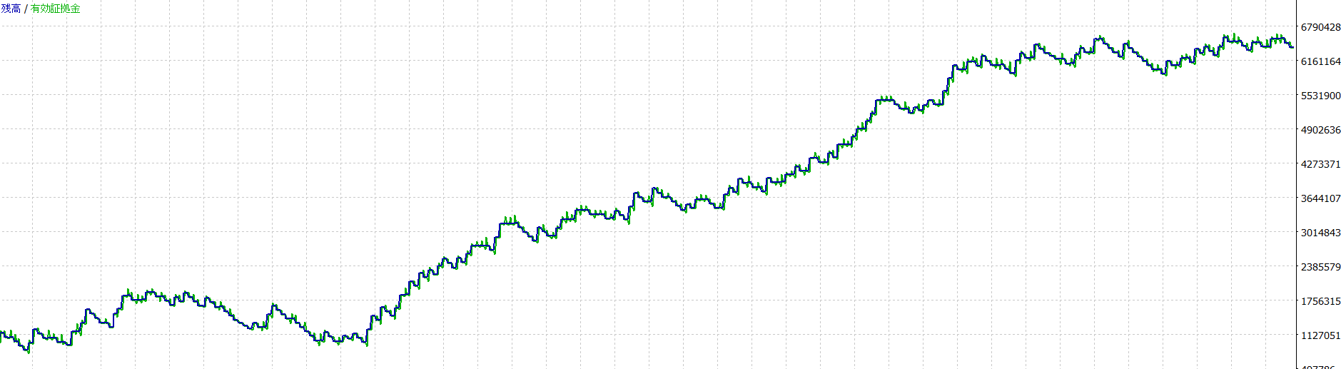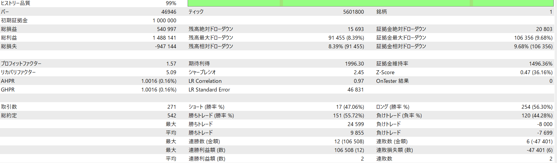 全て1,000,000JPYの証拠金、レバレッジ1:25にて計測しています。 ※レバレッジは計測結果に基本的には影響を与えませんが、極端に低いレバレッジだとポジションが取れない場合もあります。 kotei_lotがtrueの場合