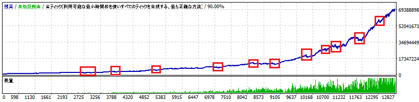 2.特徴・仕様 特徴・仕様について開示可能な範囲で詳細に、利点だけでなく、欠点も記載しますので、熟読のうえでご購入を検討いただけると幸いです。 まず最初にいきなり欠点といいますか、どのようなEAにも共通して言えることのはずですが、確実な利益を保証するものではありません。 また、上記概要において「15年間のバックテストの結果は勝率80%超」と述べましたが、一般的に高勝率のEAはリスクリワード(勝ちトレードの平均利益÷負けトレードの平均損失)が低くなる傾向があり、本EA(HISUI)もそれと同様にリスクリワードは低めであるため、いわゆるコツコツドカンになる可能性があるという欠点があります。15年間のバックテストの結果も、長期的には右肩上がりになっていますが、よく見ると以下の赤枠部分のように積み上げた利益がガクッと減るときがあります。
