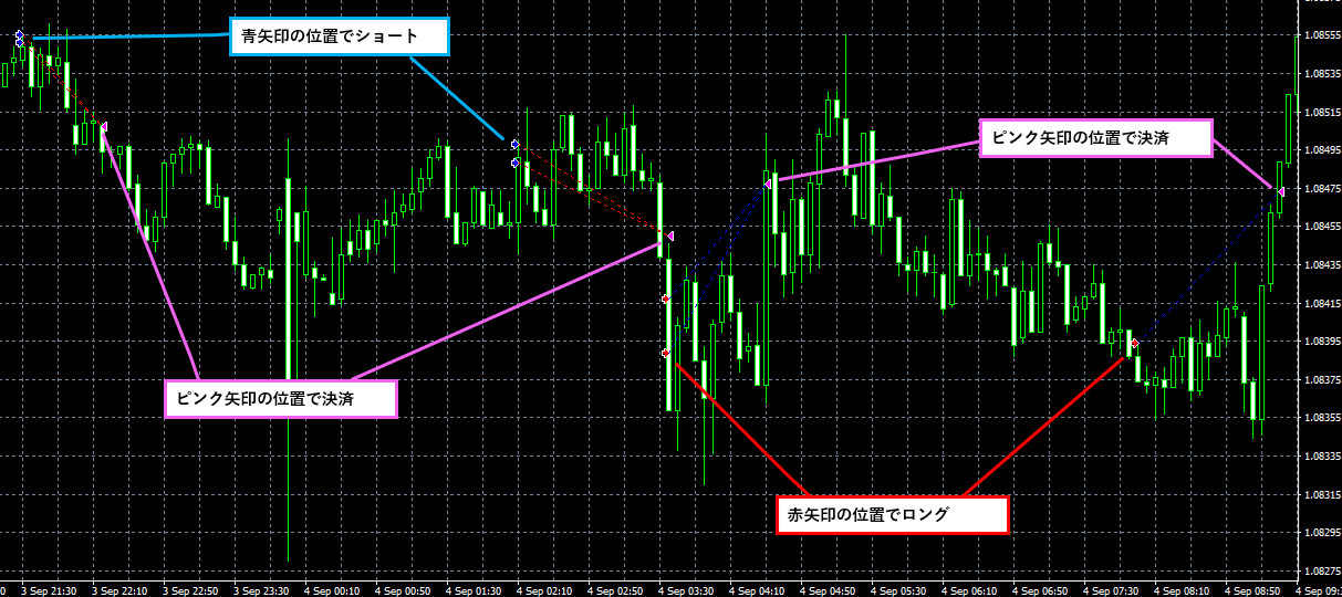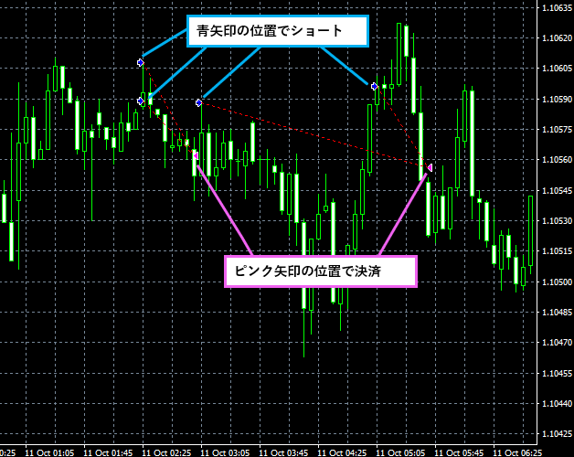 以下は本EA(HISUI)による取引位置の例です(バックテストの結果から一部抜粋)。