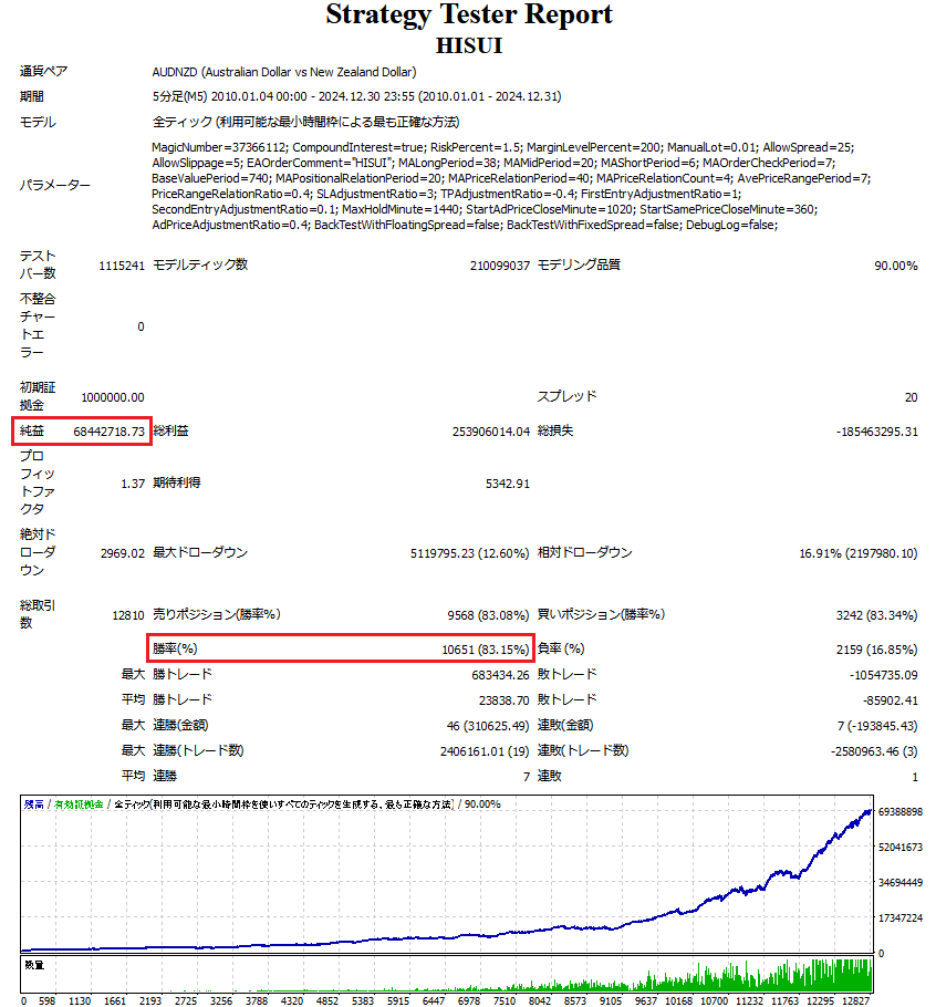 - 推奨設定で、15年間のバックテストの結果は勝率80%超、初期証拠金の約68倍の純益