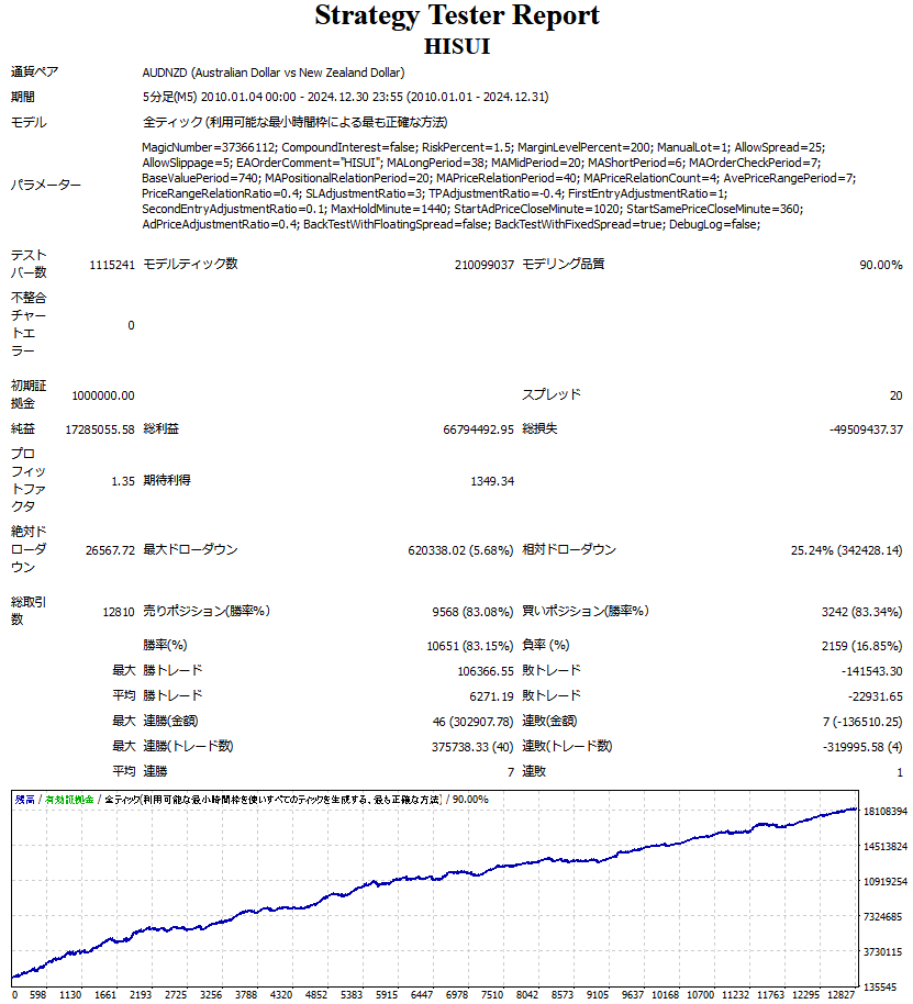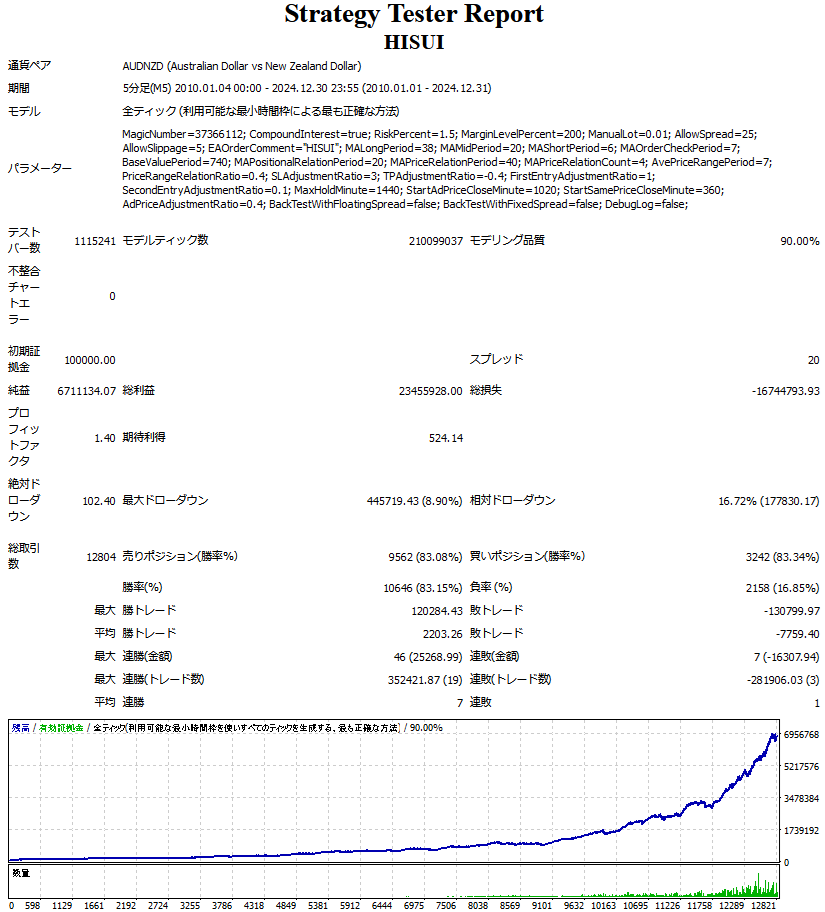 上記のとおり、かなり悩んだ結果、20以上のパラメータをご購入者様にて変更していただくことができるようにしました。 もちろん、事前にバックテストを繰り返し、本EA(HISUI)について最も推奨できる通貨ペア(AUD/NZD)における、パラメータの推奨設定値(デフォルト設定)を提供します。 推奨設定で、15年のバックテストで大きな利益を得ることができ、直近のフォワードでもプラスになることを確認していますが、未来永劫これまでと同様の(十分な利益を得られる)相場が続く保証はありません。 今後、そのような相場環境の変化があった場合でも、各種パラメータをご購入者様にて調整いただくことで、変化に適用することができる可能性があります。