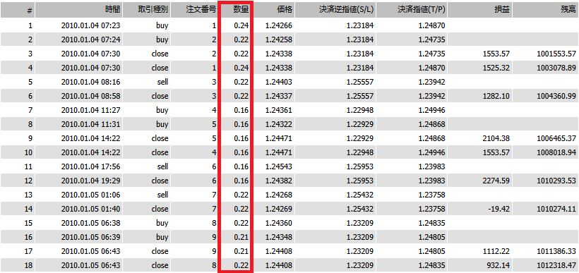 以下はバックテスト結果の一部ですが、毎回ロット数が異なることがわかります。