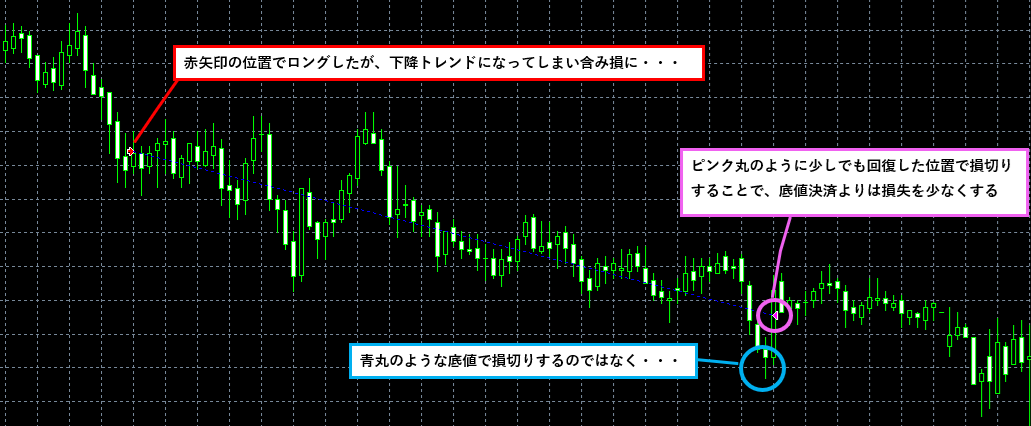 私が裁量(手動)で取引していたら、底値(上記青丸の位置)で含み損に耐えられなくなって、決済してしまうかもしれません……。