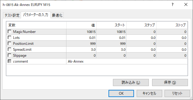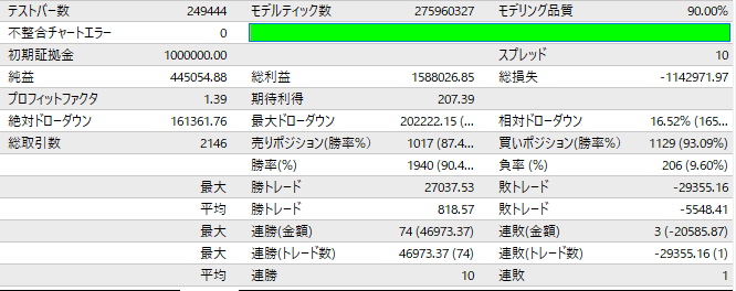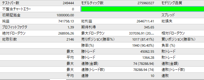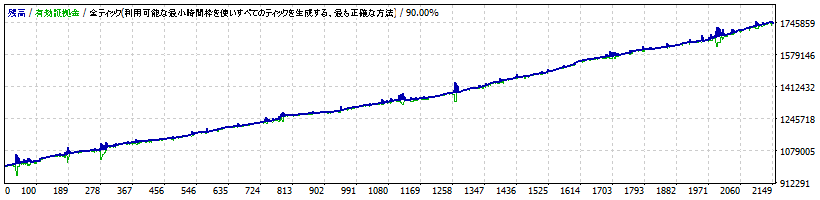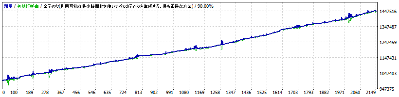 Ak-Annex EURJPY M15 期間 : 10年間 / Lots:0.05 +---- ----- ----- ----- -----+ 初期証拠金:1000000 最終証拠金:1741758 取引回数:2146 プロフィットファクタ:1.39 +---- ----- ----- ----- -----+ 最大ポジション保有数 (Sell) : 10 最大ポジション保有数 (Buy) : 9 同時最大ポジション保有数 (Buy+Sell) : 11 +---- ----- ----- ----- -----+ 取引回数(Buy) :1129 取引回数(Sell):1017 勝ち取引回数:1940 負け取引回数:206 プラス回数(Buy):1051 プラス回数(Sell):889 最大連勝数:74 最大連敗数:3 +-+-+ +-+-+ +-+-+ +-+-+ +-+-+