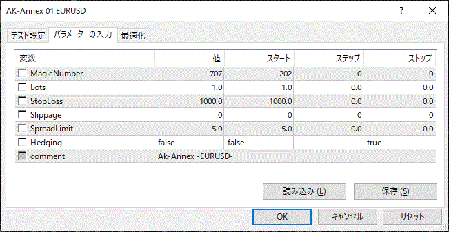 | comment | Ak-Annex -EURUSD- | 変更可能です。規定値の「Ak-Annex -EURUSD-」を削除して自由に入力していただくことができます。 |