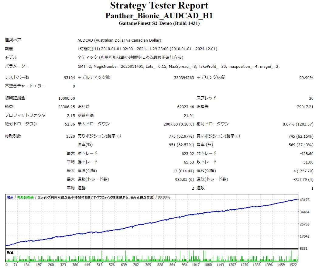 Panther Bionicは、15年以上のデータに基づいて開発された、安定性と収益性を兼ね備えたEA(自動売買プログラム)です。特にAUD/CADの通貨ペアに最適化され、初心者から上級者まで、すべてのトレーダーに安心感を提供します。