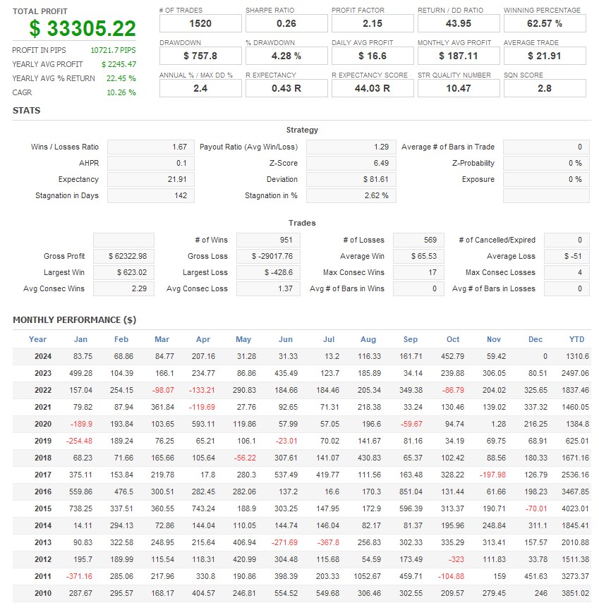 • 高収益性: プロフィットファクター2.15を達成し、長期的に収益を安定的に獲得。