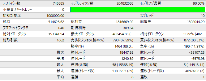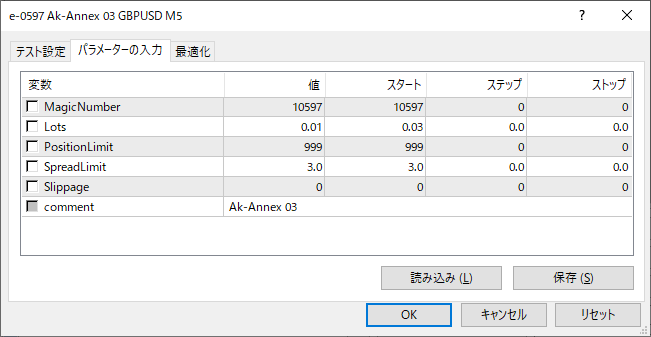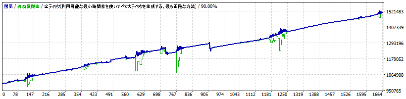 Ak-Annex 03 GBPUSD M5 期間 : 10年間 / Lots:0.02 +---- ----- ----- ----- -----+ 初期証拠金:1000000 最終証拠金:1514626 取引回数:1662 プロフィットファクタ:1.40 +---- ----- ----- ----- -----+ 最大ポジション保有数 (Sell) : 14 最大ポジション保有数 (Buy) : 22 同時最大ポジション保有数 (Buy+Sell) : 23 +---- ----- ----- ----- -----+ 取引回数(Buy) :872 取引回数(Sell):790 勝ち取引回数:1464 負け取引回数:198 プラス回数(Buy):772 プラス回数(Sell):692 最大連勝数:58 最大連敗数:5 +-+-+ +-+-+ +-+-+ +-+-+ +-+-+
