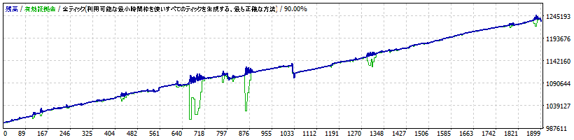 Ak-Annex 03 GBPUSD M5 期間 : 10年間 +---- ----- ----- ----- -----+ 初期証拠金:1000000 最終証拠金:1233375 取引回数:1897 プロフィットファクタ:1.39 +---- ----- ----- ----- -----+ 最大ポジション保有数 (Sell) : 10 最大ポジション保有数 (Buy) : 23 同時最大ポジション保有数 (Buy+Sell) : 24 +---- ----- ----- ----- -----+ 取引回数(Buy) :978 取引回数(Sell):919 勝ち取引回数:1686 負け取引回数:211 プラス回数(Buy):868 プラス回数(Sell):818 最大連勝数:59 最大連敗数:4 +-+-+ +-+-+ +-+-+ +-+-+ +-+-+