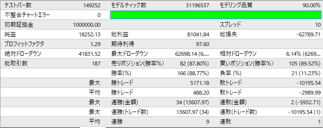 Ak-Annex 03 GBPUSD M5 期間 : 2年間 / Lots:0.01 +---- ----- ----- ----- -----+ 初期証拠金:1000000 最終証拠金:1018252 取引回数:187 プロフィットファクタ:1.29 +---- ----- ----- ----- -----+ 最大ポジション保有数 (Sell) : 5 最大ポジション保有数 (Buy) : 12 同時最大ポジション保有数 (Buy+Sell) : 13 +---- ----- ----- ----- -----+ 取引回数(Buy) :105 取引回数(Sell):82 勝ち取引回数:166 負け取引回数:21 プラス回数(Buy):94 プラス回数(Sell):72 最大連勝数:34 最大連敗数:2 +-+-+ +-+-+ +-+-+ +-+-+ +-+-+