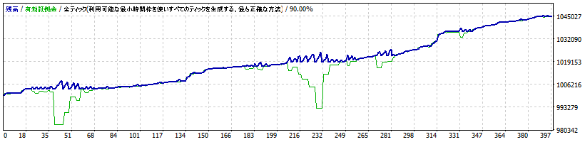 ----- ----- ----- Profit Master 2 AUDJPY M5 期間 : 2年間 Lots : 0.01 (最小ロットで実施) ----- ----- ----- 最大ポジション保有数 (Sell) : 14 最大ポジション保有数 (Buy) : 6 同時最大ポジション保有数 (Buy+Sell) : 16 ----- ----- ----- 初期証拠金:1000000 最終証拠金:1044701 取引回数:396 プロフィットファクタ:1.45 ----- ----- ----- 取引回数(Buy) :157 取引回数(Sell):239 勝ち取引回数:320 負け取引回数:76 プラス回数(Buy):130 プラス回数(Sell):190 最大連勝数:24 最大連敗数:2 平均連勝:4 平均連敗:1 勝トレード最高額:3025 最大DD:65557 最大DD(%):6.43 相対DD:65557 相対DD(%):6.43 ----- ----- ----- 総純益:143533 総損失:-98832 期待利得:113 最低残高評価値:953490 マージンレベル最小値:0 最適化基準値:0 ----- ----- -----