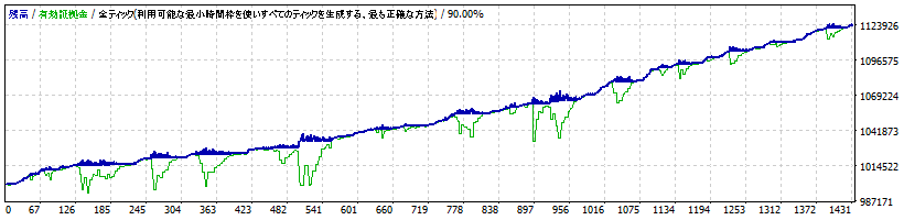----- ----- ----- Coral EURJPY M15 期間 : 10年間 Lots : 0.01 (最小ロットで実施) ----- ----- ----- 最大ポジション保有数 (Sell) : 57 最大ポジション保有数 (Buy) : 51 同時最大ポジション保有数 (Buy+Sell) : 64 ----- ----- ----- 初期証拠金:1000000 最終証拠金:1370108 取引回数:5396 プロフィットファクタ:1.16 ----- ----- ----- 取引回数(Buy) :2819 取引回数(Sell):2577 勝ち取引回数:4117 負け取引回数:1279 最大連勝数:13 最大連敗数:3 平均連勝:3 平均連敗:1 勝トレード最高額:4499 最大DD:505032 最大DD(%):44.88 相対DD:505032 相対DD(%):44.88 ----- ----- -----