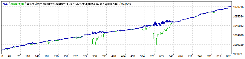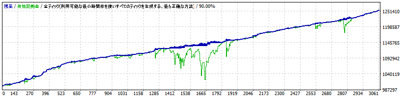 ----- ----- ----- CoReef NZDJPY M15 期間 : 10年間 Lots : 0.01 (最小ロットで実施) ----- ----- ----- 最大ポジション保有数 (Sell) : 30 最大ポジション保有数 (Buy) : 21 同時最大ポジション保有数 (Buy+Sell) : 35 ----- ----- ----- 初期証拠金:1000000 最終証拠金:1253450 取引回数:3057 プロフィットファクタ:1.30 ----- ----- ----- 取引回数(Buy) :1565 取引回数(Sell):1492 勝ち取引回数:2502 負け取引回数:555 最大連勝数:27 最大連敗数:3 平均連勝:5 平均連敗:1 勝トレード最高額:4513 最大DD:140592 最大DD(%):12.48 相対DD:140592 相対DD(%):12.48 ----- ----- -----