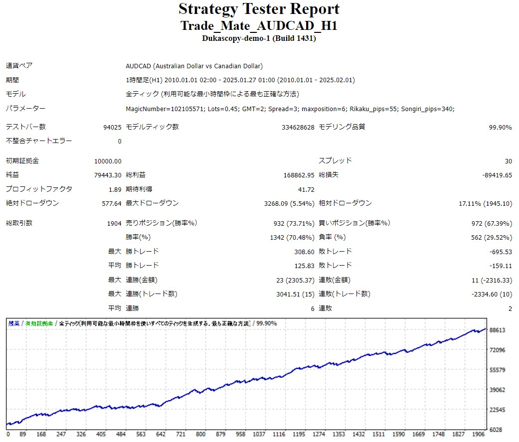 Trade_Mate_AUDCAD_H1は、安定したパフォーマンスと徹底したリスク管理を両立するトレードシステムです。