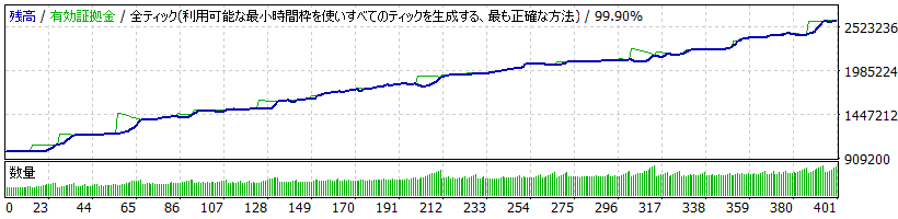 ーーーーーーーーーーーーーーーーーーーーーーーーーーーーーーーーーーーーーーーーーーーー (4)((非推奨ですが参考に))【2年間 稼働】:複利 × ロット倍率5倍(100万円 → 約420万円) • 2年間という比較的長い期間を、あえて複利運用かつロット倍率5倍でテストした例。 • 長期で複利を回すほど破綻リスクは高まりますが、試しにやってみました。