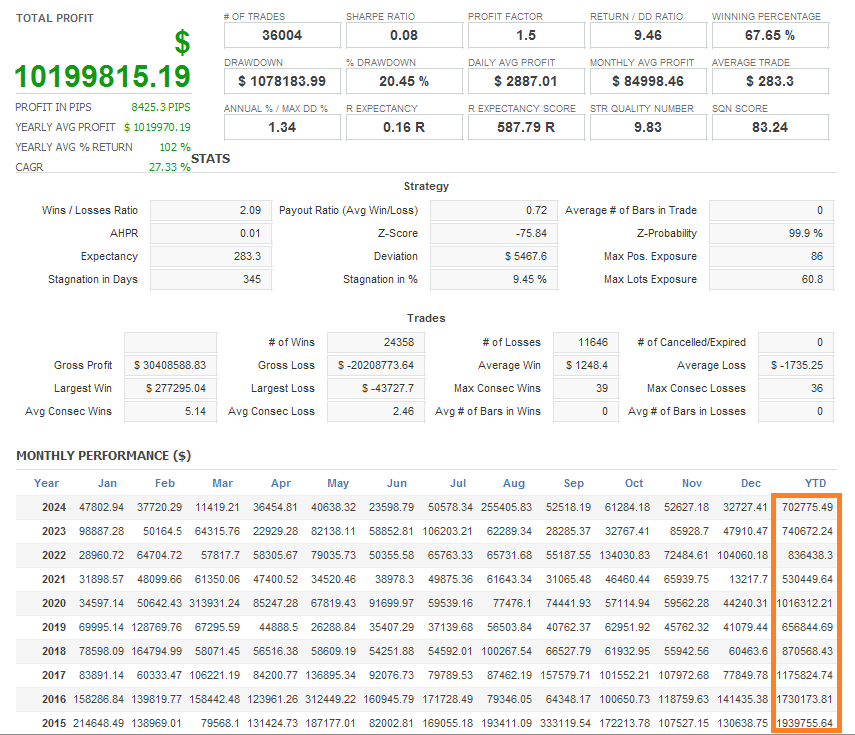 過去10年間の取引回数は36,004回にのぼり、十分なサンプル数を確保しています。これにより、統計的に信頼性の高いデータを取得し、一時的な幸運ではなく、長期的な安定収益を生み出すEAであることが証明されています。