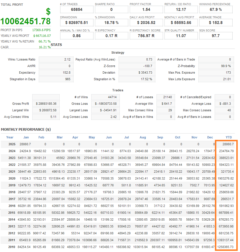 過去15年間の取引回数は65854回にのぼり、十分なサンプル数を確保しています。これにより、統計的に信頼性の高いデータを取得し、一時的な幸運ではなく、長期的な安定収益を生み出すEAであることが証明されています。