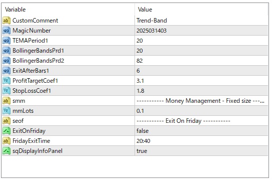 時間足: H1 バックテスト期間: 2015年1月5日 ~ 2025年3月4日 バックテストエンジン: MetaTrader 4 3. 取引パラメータ Magic Number: 20250316 TEMA期間: 20 ボリンジャーバンド1期間: 20 ボリンジャーバンド2期間: 82 エグジットバー数: 6 利益目標係数: 3.1(ATRベース) ストップロス係数: 1.8(ATRベース) 4. 取引ルール 4.1 取引時間と制限 金曜日のエグジット: 無効(20:40 にエグジットしない) 4.2 エントリー条件(バーオープン時) ロングエントリー条件: 過去5Bar間での曜日の変動: 2Bar前の曜日が3bar前の曜日よりも高い TEMAとボリンジャーバンドの関係: TEMA(20)[2] ≠ BollingerBands(20, 2, PRICE_CLOSE).Upper[3] SessionClose(4:22)[2] ≠ BollingerBands(82, 2.2, PRICE_CLOSE).Lower[3] ショートエントリー条件: 過去5バー間での曜日の変動: 2バー前の曜日が3バー前の曜日よりも低い TEMAとボリンジャーバンドの関係: TEMA(20)[2] = BollingerBands(20, 2, PRICE_CLOSE).Lower[3] SessionClose(4:22)[2] = BollingerBands(82, 2.2, PRICE_CLOSE).Upper[3] 4.3 エグジット条件(バーオープン時) ロングエグジットシグナルおよびショートエグジットシグナルはデフォルトで無効 ExitAfterBars1 = 6 の設定により、6Bar後にエグジット 4.4 取引実行ルール ロングエントリーの処理 LongEntrySignal の条件を満たした場合、市場成行注文でロングポジションを開く ストップロス = StopLossCoef1 * ATR(20) 利益確定 = ProfitTargetCoef1 * ATR(20) 6Bar後に自動決済