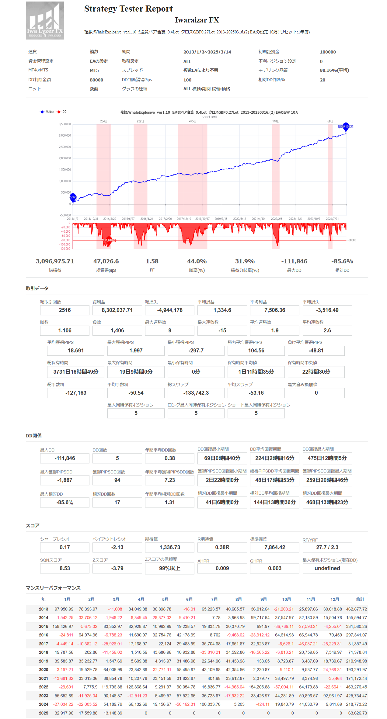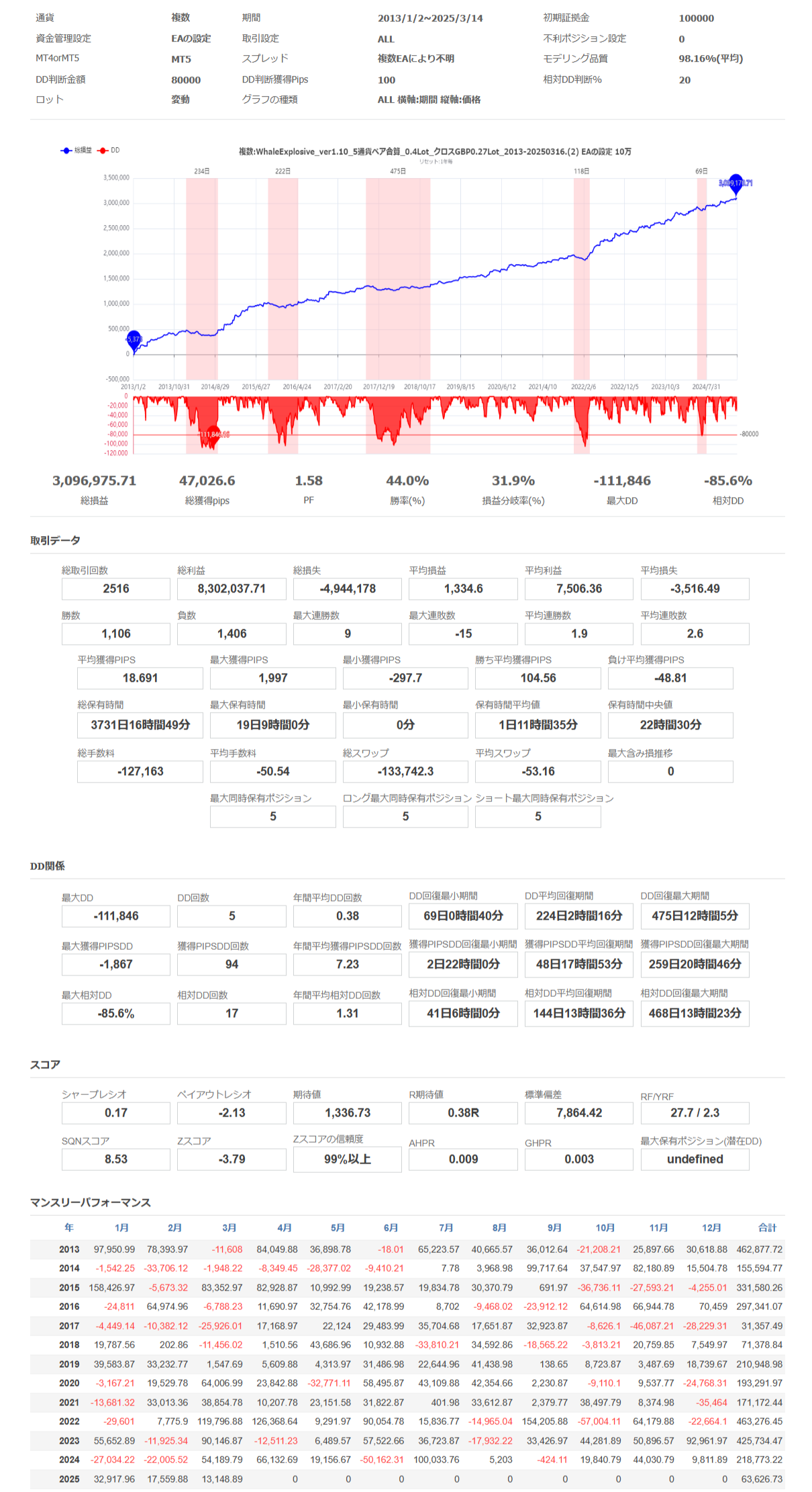 Increasing the lot size forcibly due to a high winning rate can, in rare instances, depending on the EA, lead to substantial Pips loss when a loss occurs. It is crucial to verify the SL Pips and the number of positions held before operating with an appropriate lot.