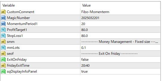 ■ パラメータ設定 • MagicNumber:ポジション識別用番号(初期値:2025032201) • mmLots:固定ロットサイズ(取引量)(初期値:0.1) • MomentumPeriod1:モメンタム指標の期間設定(初期値:20) • ProfitTarget1:利確幅(pips)(初期値:80) • StopLoss1:損切り幅(pips)(初期値:80) • ExitOnFriday:金曜日に全ポジションを決済(初期値:false(任意でtrue)) • DontTradeOnWeekends:週末トレードを制限(初期値:false(任意でtrue)) • LimitTimeRange:取引時間帯を制限(初期値:false(必要に応じてtrue)) • MaxDistanceFromMarketPct:価格乖離の最大許容%(初期値:6) • MaxTradesPerDay:1日の最大取引数(初期値:0(制限なし))