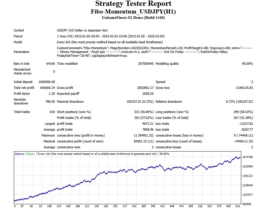 ■ EA名称 Fibo-Momentum_USDJPY(H1) ■ 対応環境 ・通貨ペア:USDJPY ・時間足:1時間足(H1) ・バックテスト期間:2015年1月5日〜2025年1月28日