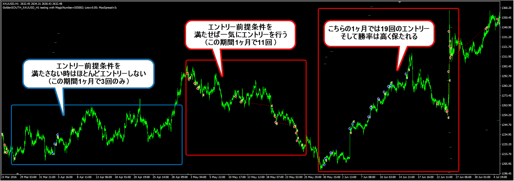 前述の通り、GoldenSOUTHはトレンド時以外は取引をしない仕様です。そのため過去のドローダウン時にトレンドが発生するまで資金が全く増えていない期間が存在します。