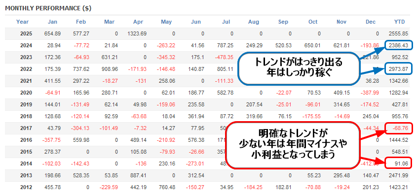 ただしこの年度ごとの取引履歴のような相場に左右されやすいEAであることを理解していただくようお願いします。