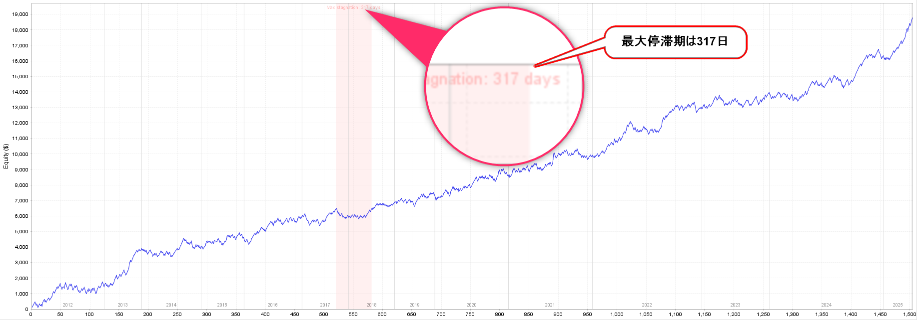 上記画像の真ん中あたりの2017年後半にDDこそ小さいものの、その後過去の資金最高点を抜けるまで317日かかっております。