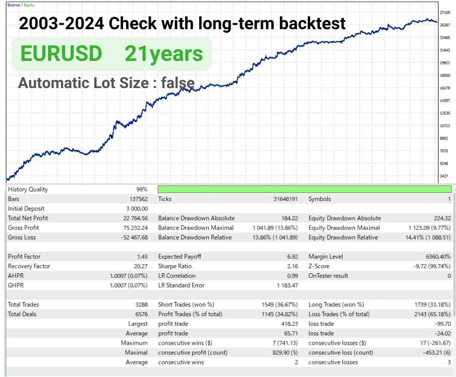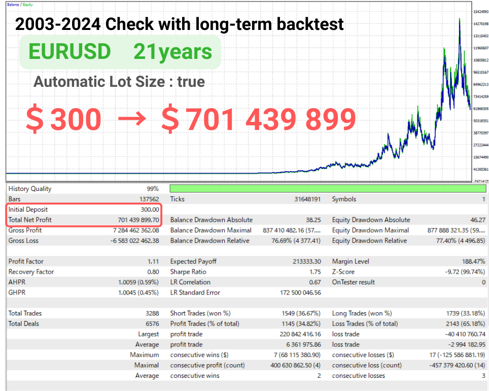 勝率自体は高くありませんが、1回のトレードあたりの損失を最小限に抑えるリスク管理と、複利機能(自動ロットサイズ調整)による長期運用を前提とした資金成長戦略により、少額の資金からでも大きな利益を狙うことが可能です。
