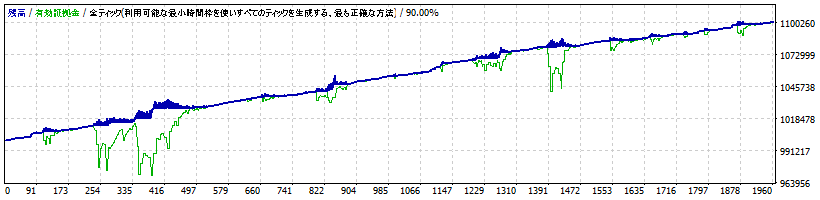 最大ポジション保有数 (Sell) : 19 最大ポジション保有数 (Buy) : 15 同時最大ポジション保有数 (Buy+Sell) : 24 ----- ----- ----- 初期証拠金:1000000 最終証拠金:1100757 取引回数:1957 プロフィットファクタ:1.20 ----- ----- ----- 取引回数(Buy) :975 取引回数(Sell):982 勝ち取引回数:1588 負け取引回数:369 最大連勝数:36 最大連敗数:3 平均連勝:5 平均連敗:1 勝トレード最高額:3056 最大DD:65102 最大DD(%):6.41 相対DD:65102 相対DD(%):6.41 ----- ----- -----