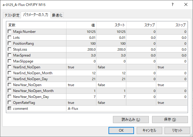 A-Flux CHFJPY M15 期間 : 2年間 Lots : 0.01 (最小ロットで実施) ----- ----- ----- ----- ----- -----