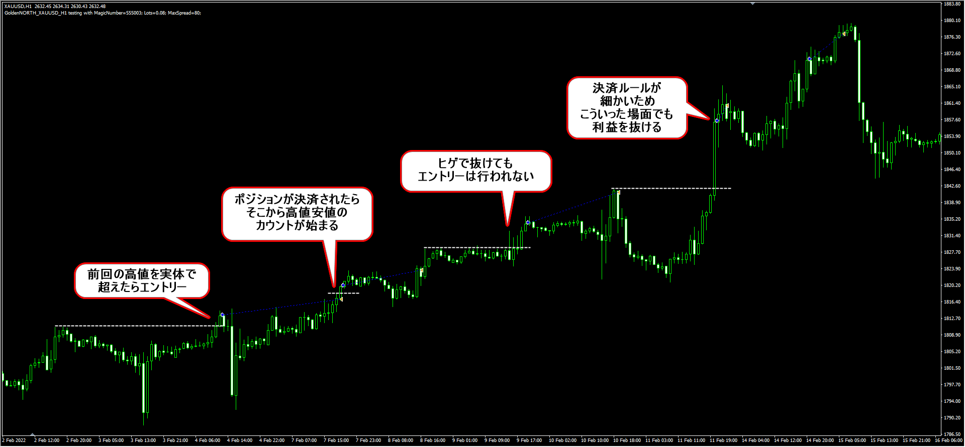 GoldenNORTHは高値や安値のブレイクを察知し、ブレイク時にボリンジャーバンドの±1σの外側に位置しているときのみエントリーを行うロジックで稼働しています。