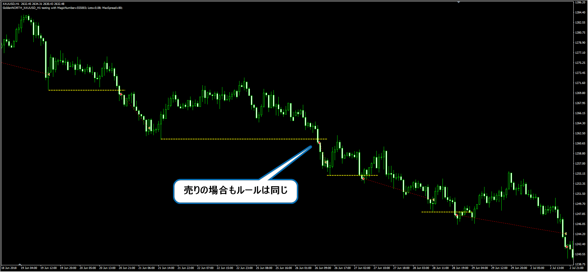 勝率が高い手法の多くが「エントリー後にすぐに利確する」という手段を使っていることは否めません。 GoldenNORTHもトレーリングを発動させ、その後は逆行されたらすぐに決済を行います。