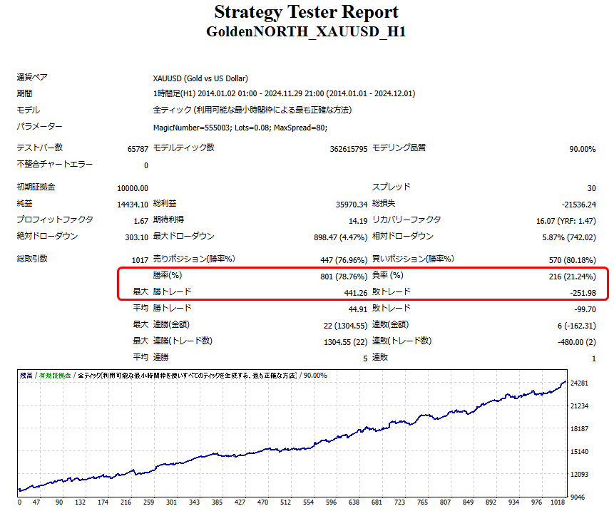 GoldenNORTHは過去10年間のバックテスト上では、マイナス収支の年はありませんでした。