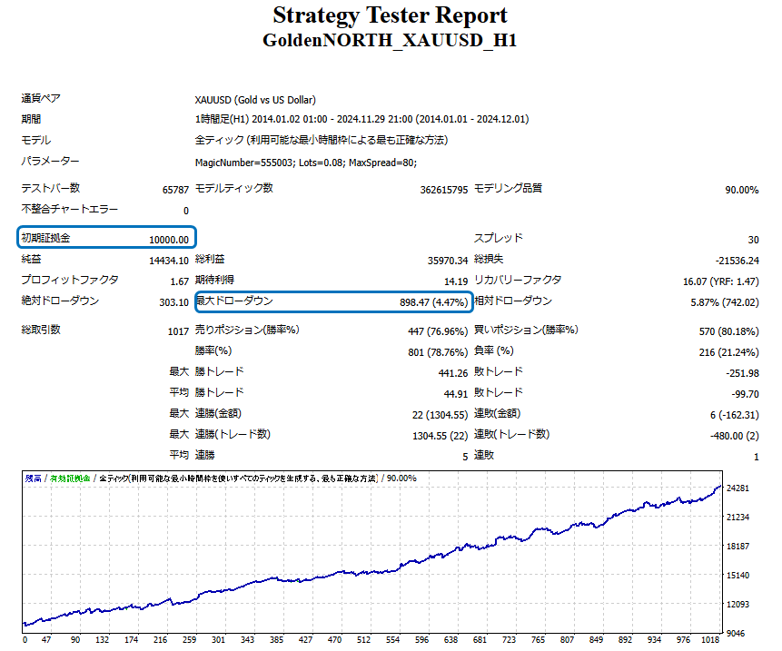EAを運用するにあたり気にしてほしいのは、最大DDが初期準備金の何%になっているか?というところです。