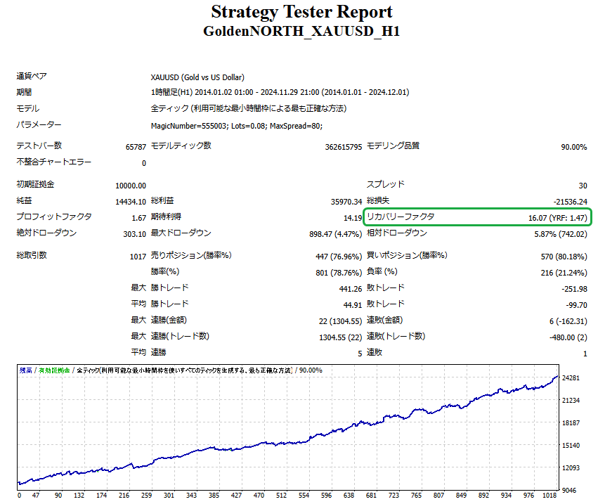 GoldenNORTHのリカバリーファクターは16.07と良いEAの基準とされる「10年で10以上」を上回り、年間平均でも「1.47」となっております。