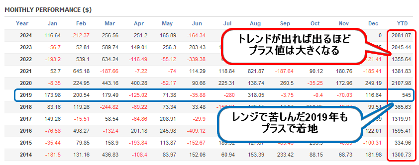 レンジかトレンドなのか、利益額がその年の相場に左右されやすいEAであることを理解していただくようお願いします。