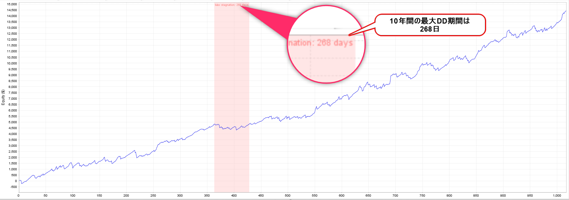 上記画像の真ん中あたりの2018年~2019年にかけて停滞期が存在しており、268日の間資金が増えていない時期があります。