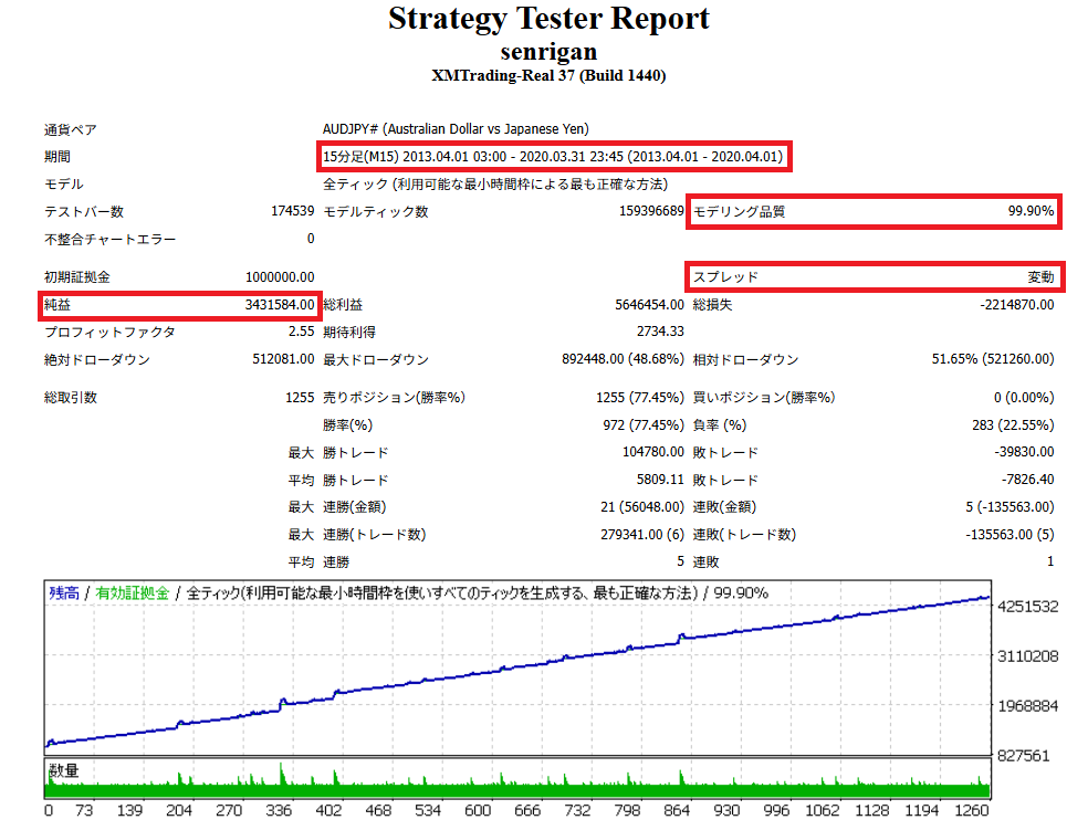 最大DD:48.6%(勝率同様、複数ポジションを持った際にみられる現象です。含み益の状態で同時決済が行なわれるため残高が減ってしまうわけではありません)