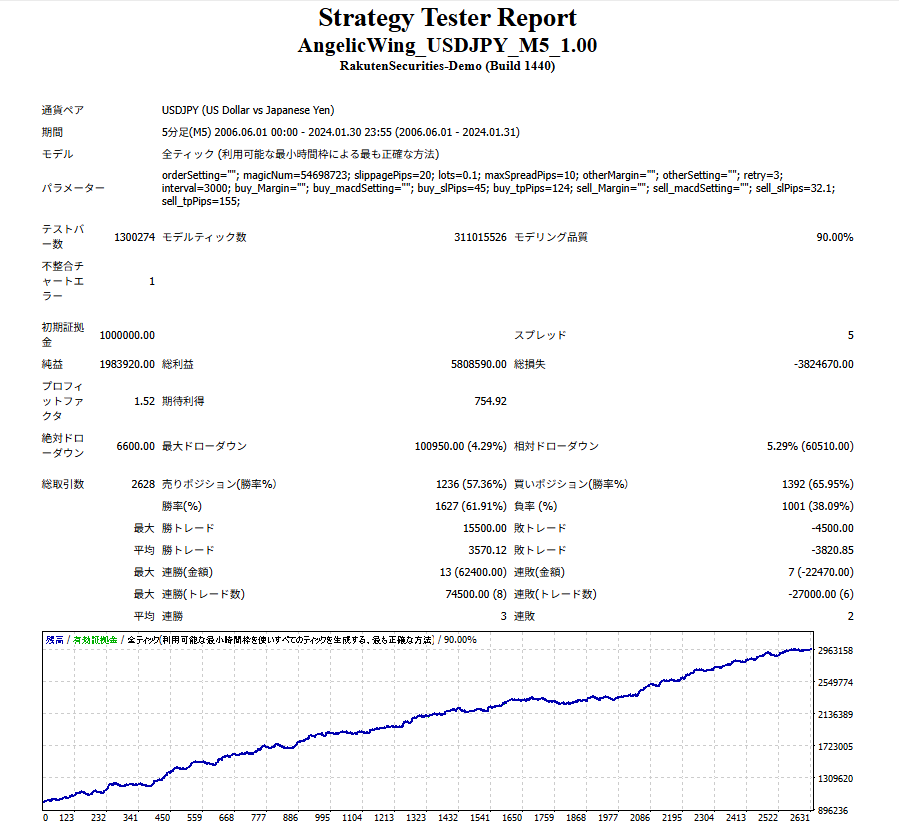 ・計測期間:2006.06.01 - 2024.01.31(約18年) ・PF(プロフィットファクター):1.52 ・期待利得:754.92 ・最大ドローダウン:4.29% ・勝率:61.91%