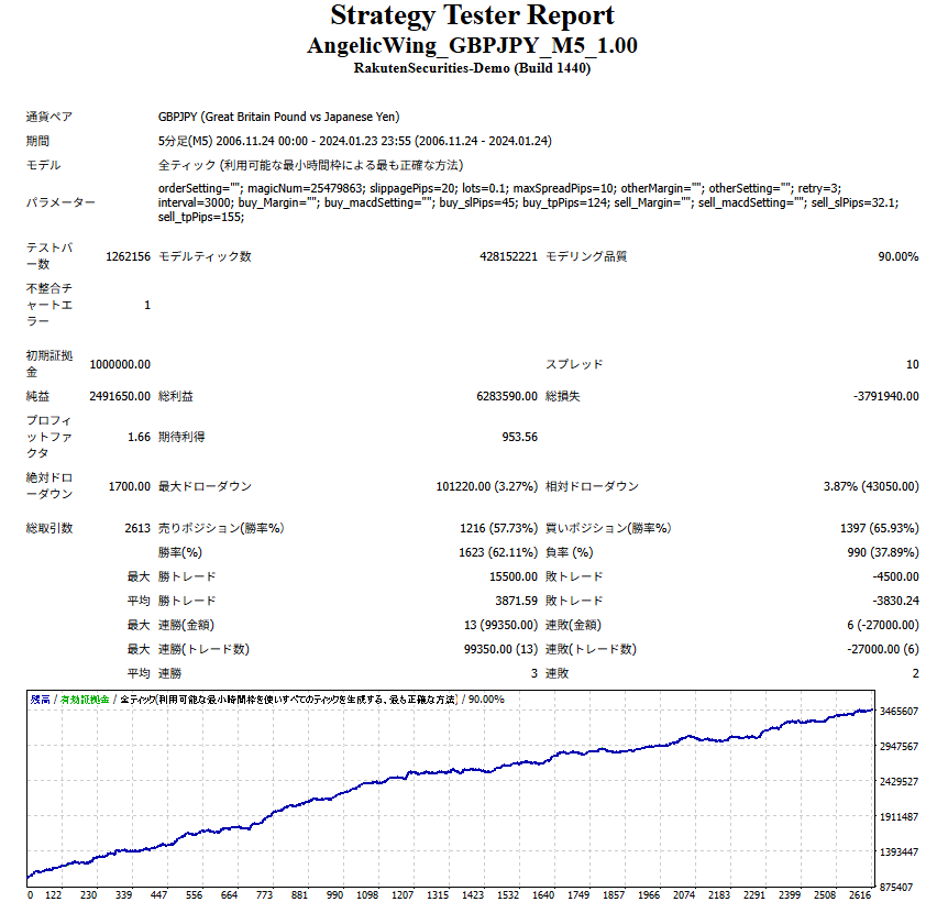・計測期間:2006.11.24 - 2024.01.24(約17年) ・PF(プロフィットファクター):1.66 ・期待利得:953.56 ・最大ドローダウン:3.27% ・勝率:62.11%