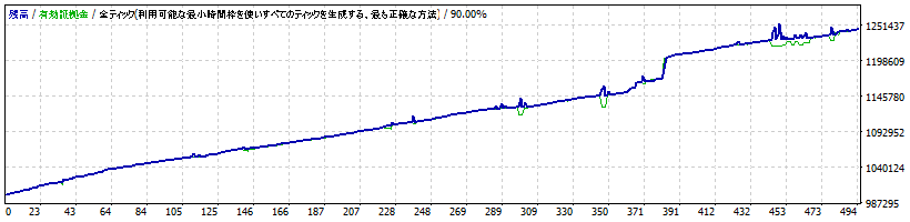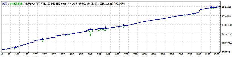 ----- ----- ----- TopEarn EURJPY M15 期間 : 2年間 Lots : 0.05 ----- ----- ----- 最大ポジション保有数 (Sell) : 6 最大ポジション保有数 (Buy) : 5 同時最大ポジション保有数 (Buy+Sell) : 7 ----- ----- ----- 初期証拠金:1000000 最終証拠金:1245133 取引回数:493 プロフィットファクタ:2.37 ----- ----- ----- 取引回数(Buy) :362 取引回数(Sell):131 勝ち取引回数:466 負け取引回数:27 プラス回数(Buy):351 プラス回数(Sell):115 最大連勝数:85 最大連敗数:2 平均連勝:19 平均連敗:1 勝トレード最高額:17449 最大DD:183899 最大DD(%):16.02 相対DD:183899 相対DD(%):16.02 ----- ----- ----- 総純益:424034 総損失:-178902 期待利得:497 最低残高評価値:963783 マージンレベル最小値:0 最適化基準値:0 ----- ----- -----
