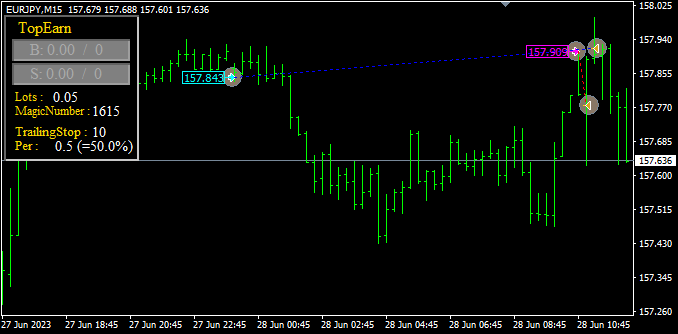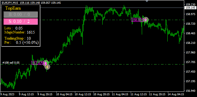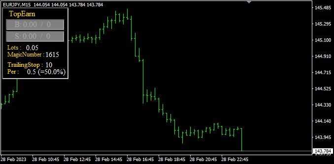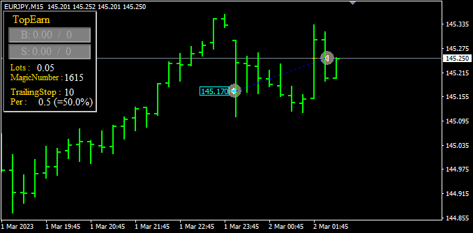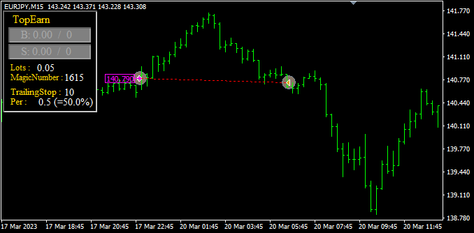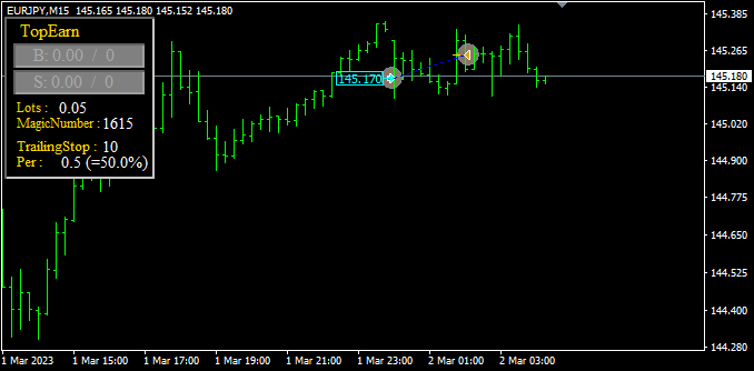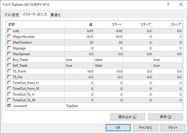 Lots:ロットの数値 MagicNumber:マジックナンバー Max Position:ポジション最大数 Slippage:スリッページの値 MaxSpread:スプレッドの最大値 Buy_Trade:買いトレードを行うか否かの設定 Sell_Trade:売りトレードを行うか否かの設定 TS_Point:トレーリングストップの開始位置を指定 TS_Per:トレーリングストップの位置を指定 TimeOut_From_H:エントリーしない開始時間のHourの値 TimeOut_From_M :エントリーしない開始時間のMinuteの値 TimeOut_To_H :エントリーしない終了時間のHourの値 TimeOut_To_M :エントリーしない終了時間のMinuteの値 Comment :MT4下部の取引コメント欄に表示させる文字