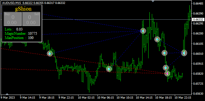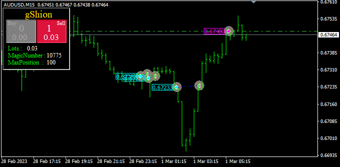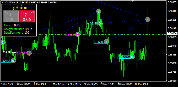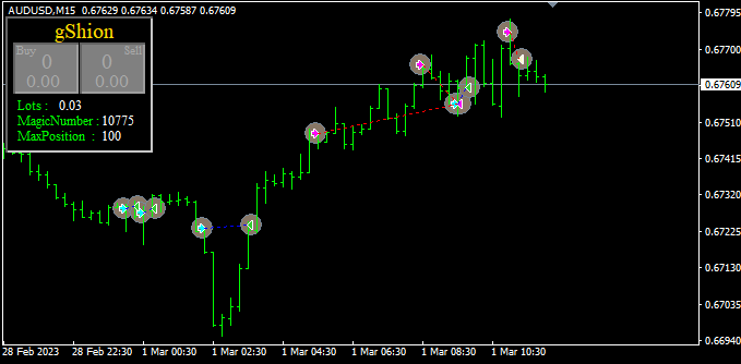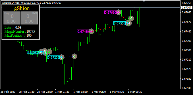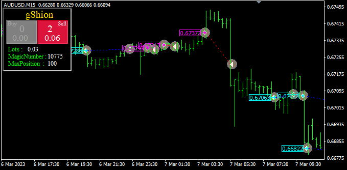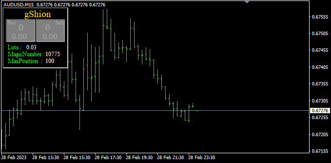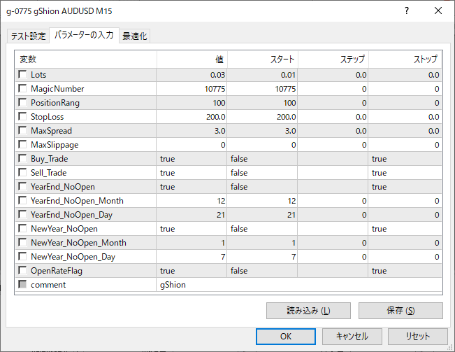 ----- ----- ----- gShion (ジー・シオン) AUDUSD M15 期間 : 2年間 Lots : 0.03 (小ロットで実施) ----- ----- ----- 最大ポジション保有数 (Sell) : 7 最大ポジション保有数 (Buy) : 15 同時最大ポジション保有数 (Buy+Sell) : 17 ----- ----- ----- 初期証拠金:1000000 最終証拠金:1216891 取引回数:2493 プロフィットファクタ:1.32 ----- ----- ----- 取引回数(Buy) :1300 取引回数(Sell):1193 勝ち取引回数:2012 負け取引回数:481 最大連勝数:36 最大連敗数:4 平均連勝:5 平均連敗:1 勝トレード最高額:6559 最大DD:101580 最大DD(%):8.76 相対DD:101580 相対DD(%):8.76 ----- ----- ----- ◆パラメーター MagicNumber:マジックナンバー Lots:ロットの数値 PositionRang: StopLoss:ストップロス値 MaxSpread:スプレッド最大値 MaxSlippage:スリッページの値 Buy_Trade: Sell_Trade: TimeOut_From_H:エントリーしない開始時間のHourの値 TimeOut_From_M :エントリーしない開始時間のMinuteの値 TimeOut_To_H :エントリーしない終了時間のHourの値 TimeOut_To_M :エントリーしない終了時間のMinuteの値 Comment :MT4下部の取引コメント欄に表示させる文字