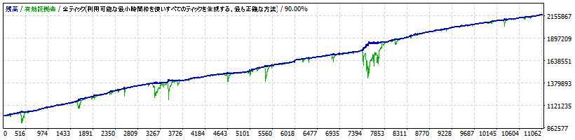 ----- ----- ----- gShion AUDUSD M15 期間 : 10年間 Lots : 0.03 (小ロットで実施) ----- ----- ----- 最大ポジション保有数 (Sell) : 30 最大ポジション保有数 (Buy) : 35 同時最大ポジション保有数 (Buy+Sell) : 42 ----- ----- ----- 初期証拠金:1000000 最終証拠金:2166620 取引回数:11048 プロフィットファクタ:1.22 ----- ----- ----- 取引回数(Buy) :5679 取引回数(Sell):5369 勝ち取引回数:9082 負け取引回数:1966 最大連勝数:64 最大連敗数:4 平均連勝:5 平均連敗:1 勝トレード最高額:9855 最大DD:396236 最大DD(%):22.52 相対DD:396236 相対DD(%):22.52 ----- ----- -----