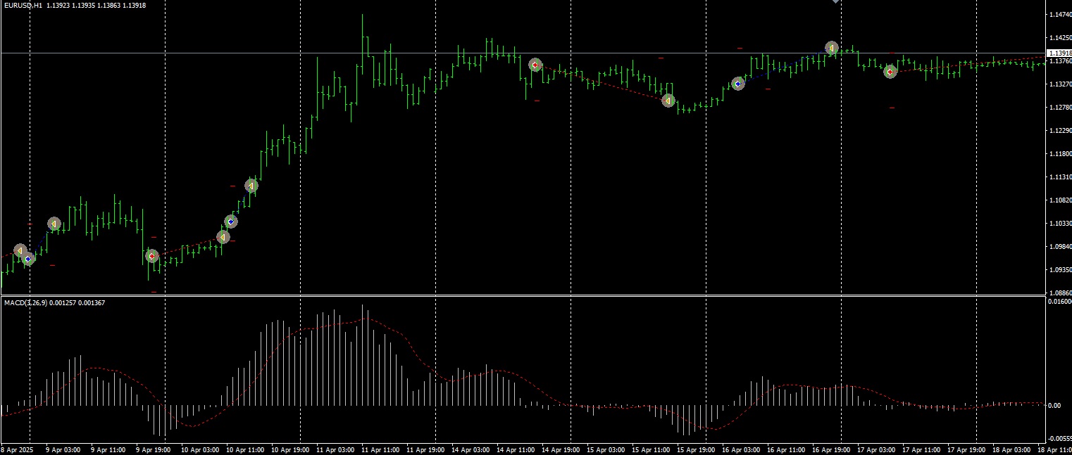 EURUSDの1時間足(H1)において、MACDのゼロラインクロスをエントリーシグナルに活用し、トレンドフォロー戦略を実装しています。