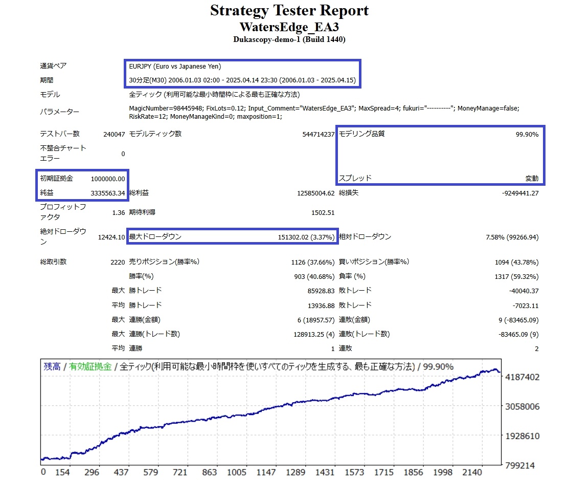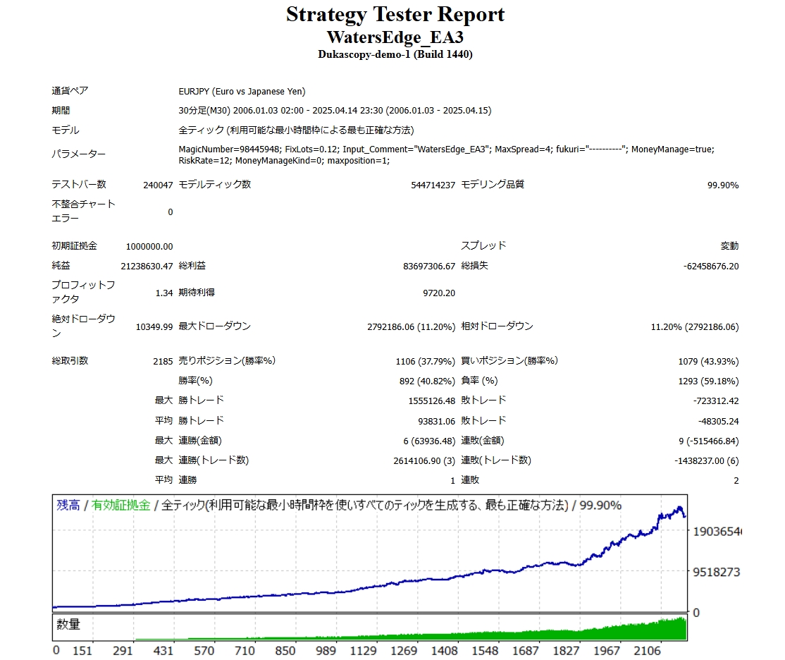 【WatersEdge_EA3 について】 クロス円としてボラティリティの期待できるユーロ円(EURJPY)に特化した「損小利大」タイプの自動売買ソフト(EA)です。大きな値動きを狙い、損失を抑えながら利益を最大化することを目的としています。 ・MA(移動平均線)やBB(ボリンジャーバンド)といった古典的なインジケーターを中心に据えた損小利大のロジックを搭載しており、損失を抑えつつ最大の利益を狙います。 ・複利機能を搭載で、利益を再投資しさらなる資産増加を狙います。 ・2006年からの長期バックテストを実施。モデリング品質の高いTick Data Suiteの変動スプレッドを使用。(最低スプレッドは2.0pipsに設定しています)